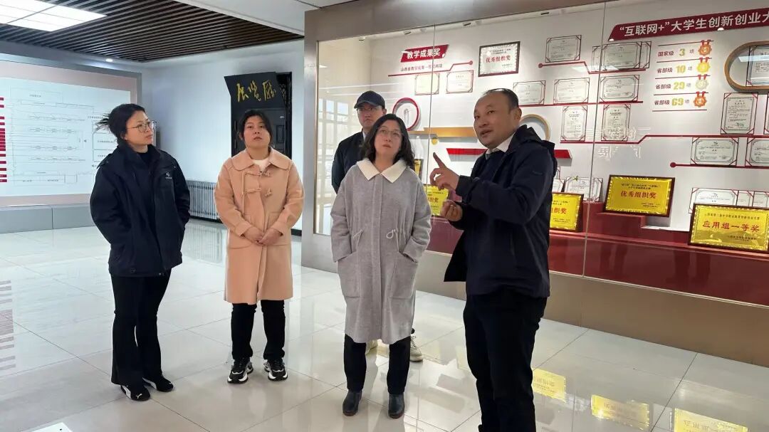 交流伊始,在白龙杰副院长的引导下,黄瑶部长一行先后参观了三创学院成果展与学生创新工作室。在成果展现场,工作人员通过实物陈列、图文展板、视频演示等多种形式,详细介绍了我校在“创新、创造、创业”领域的标志性成果——从获省级以上奖项的学生项目、专利发明,到校企合作开发的应用型成果,全方位展现了三创学院“以赛促学、以赛促教”的育人成效。随后,走进工作室,实地察看了学生创新实践场地,了解项目孵化情况,与正在开展项目研发的师生亲切交流,深入了解项目进展、技术应用及市场前景,对我校三创教育的实践导向和育人质量给予高度评价。